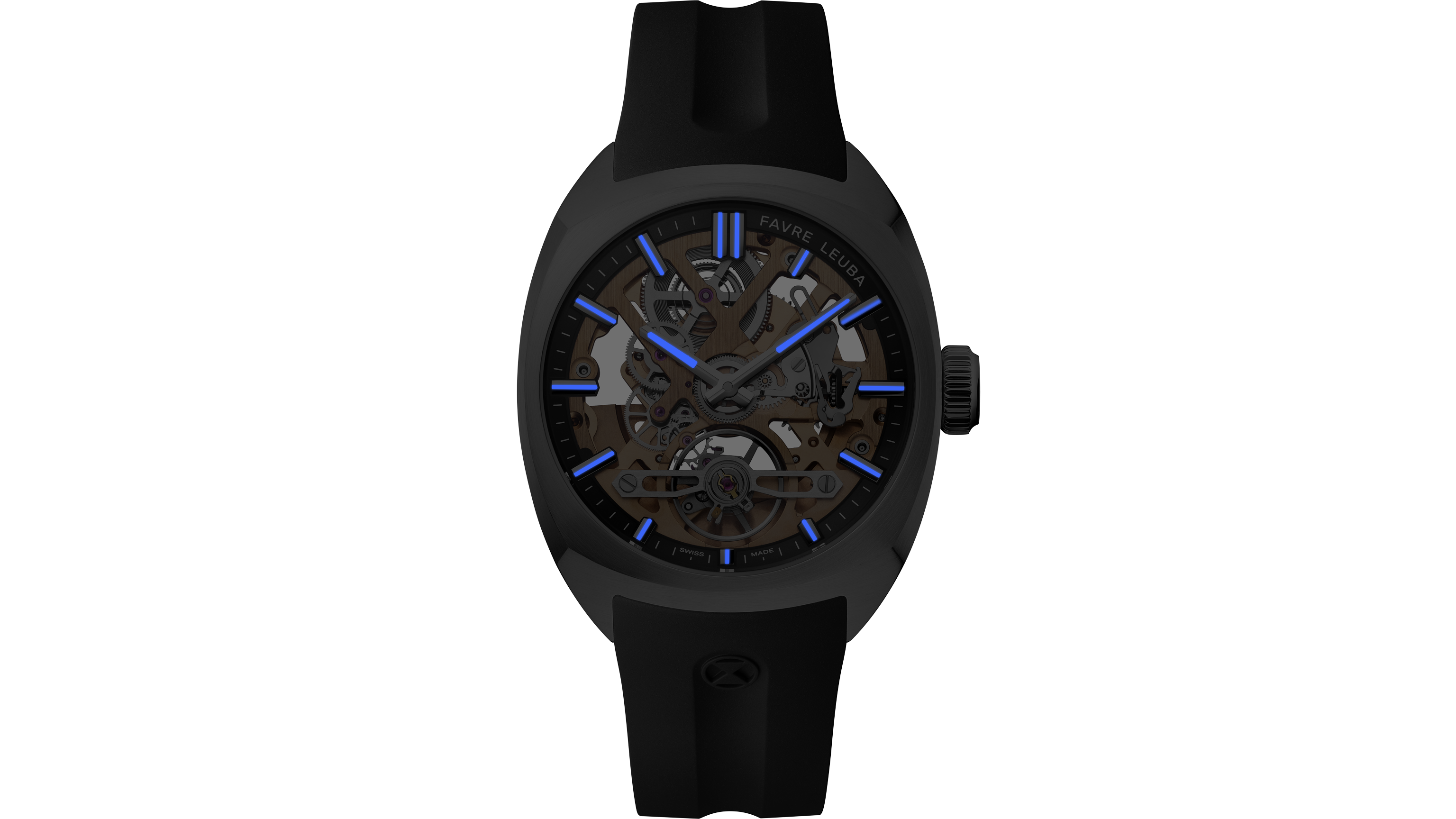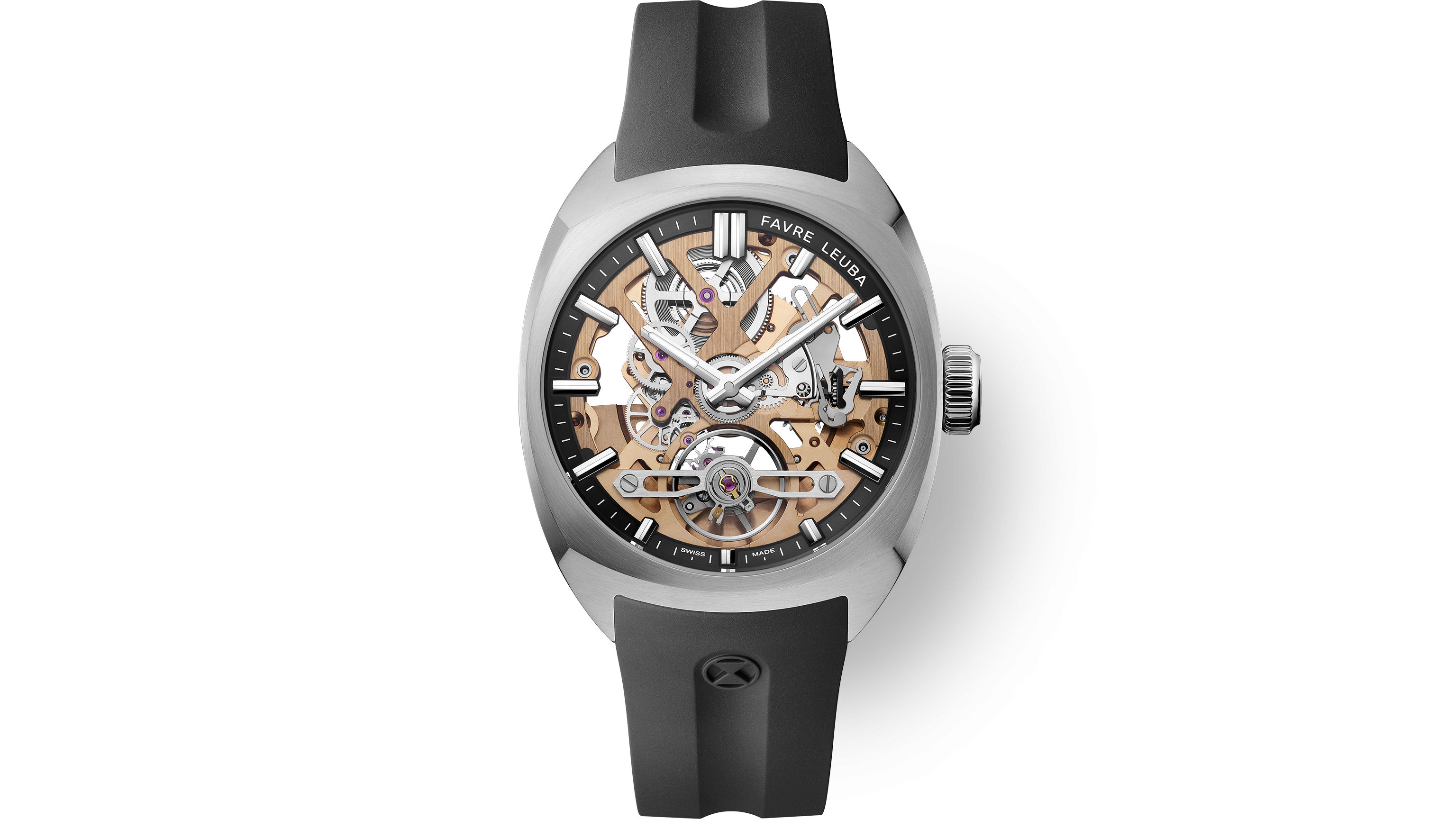 The Chief Skeleton revives the iconic cushion-shaped case in stainless steel, blending refined design with enhanced wearability. At 40mm wide, 11.76mm thick, it offers comfort across wrist sizes. Its multifaceted form balances curves and edges, with brushed surfaces and polished bevels. A curved sapphire crystal and a knurled crown embossed with the Favre Leuba logo complete the look, capturing both elegance and strength.