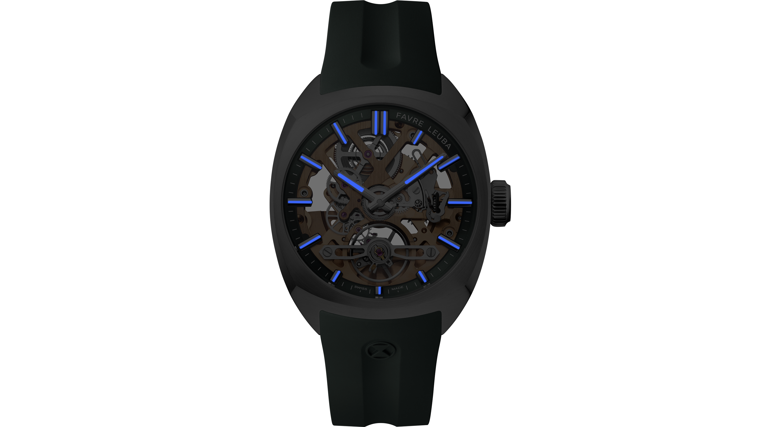 The Chief Skeleton revives the iconic cushion-shaped case in stainless steel, blending refined design with enhanced wearability. At 40mm wide, 11.76mm thick, it offers comfort across wrist sizes. Its multifaceted form balances curves and edges, with brushed surfaces and polished bevels. A curved sapphire crystal and a knurled crown embossed with the Favre Leuba logo complete the look, capturing both elegance and strength.