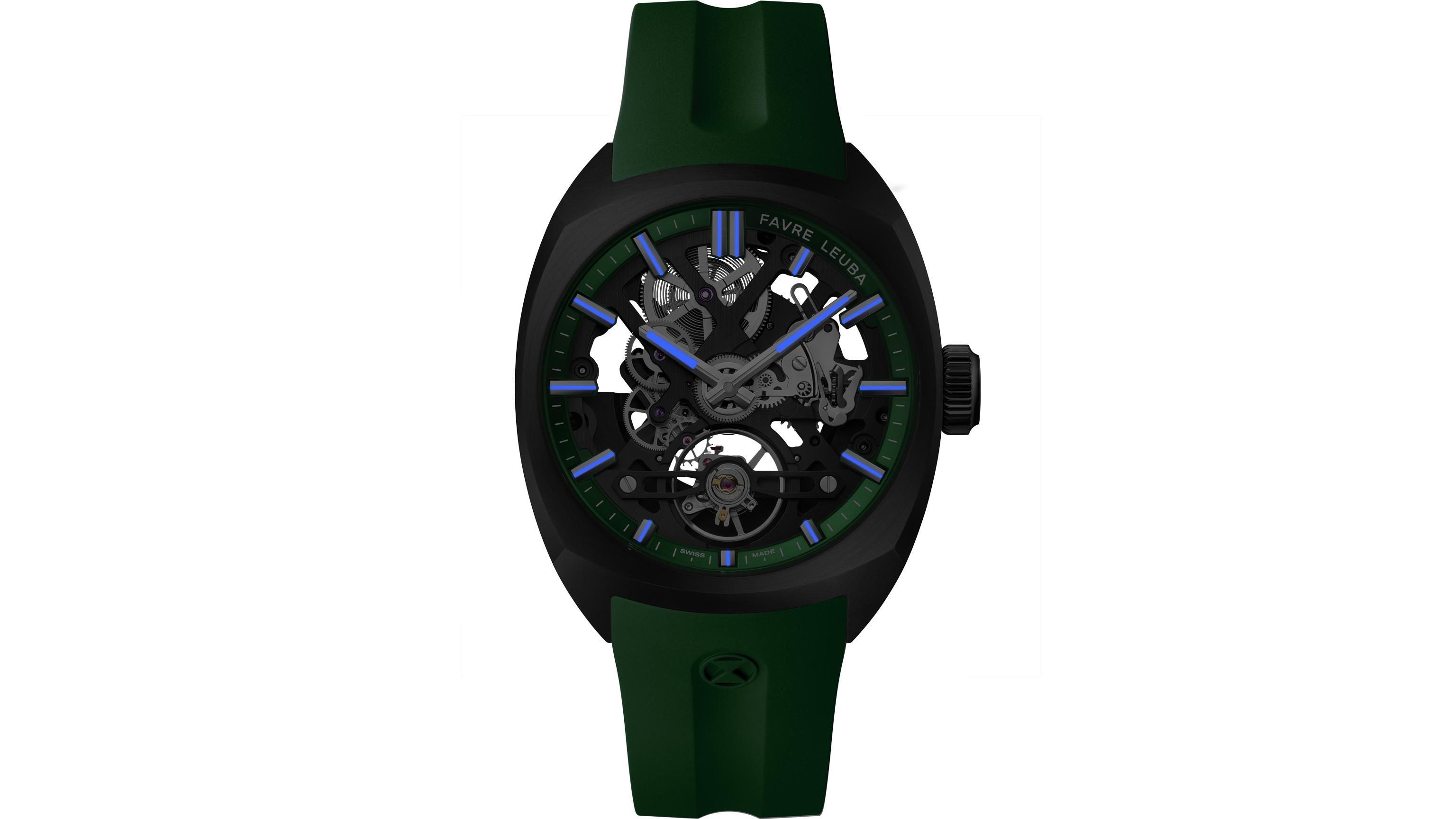 Favre Leuba’s first skeleton movement showcases a multi-layered openwork design with clean lines and maximized open space. The custom-designed balance wheel bridge and spanning bridges feature horizontal brushing, while all components are finished in black chrome for a bold look.
